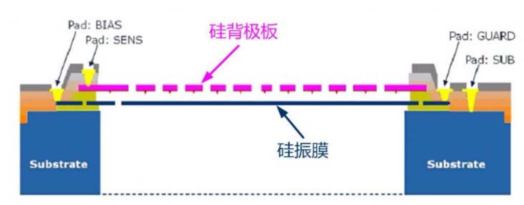 MEMS聲壓傳感器實(shí)際上是一個(gè)由硅振膜和硅背極板組成的微型電容器,硅振膜能感測(cè)聲壓的變化,將聲壓轉(zhuǎn)化為電容變化。